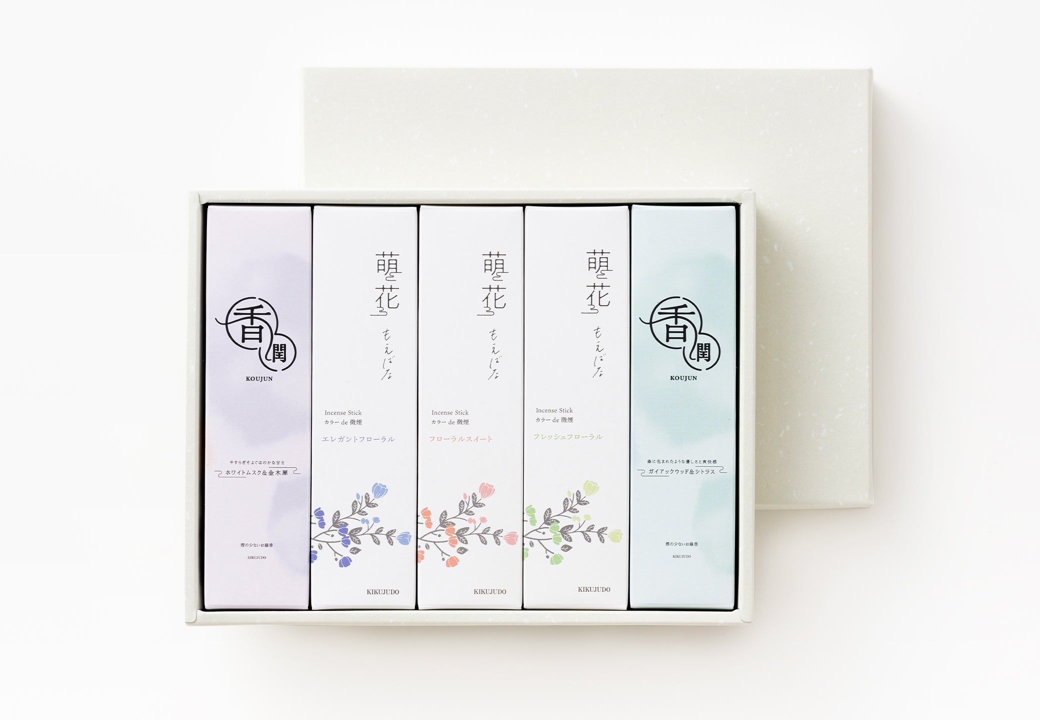 An assortment box featuring three varieties from the “Moebana” series and two from the “Koujun” series.